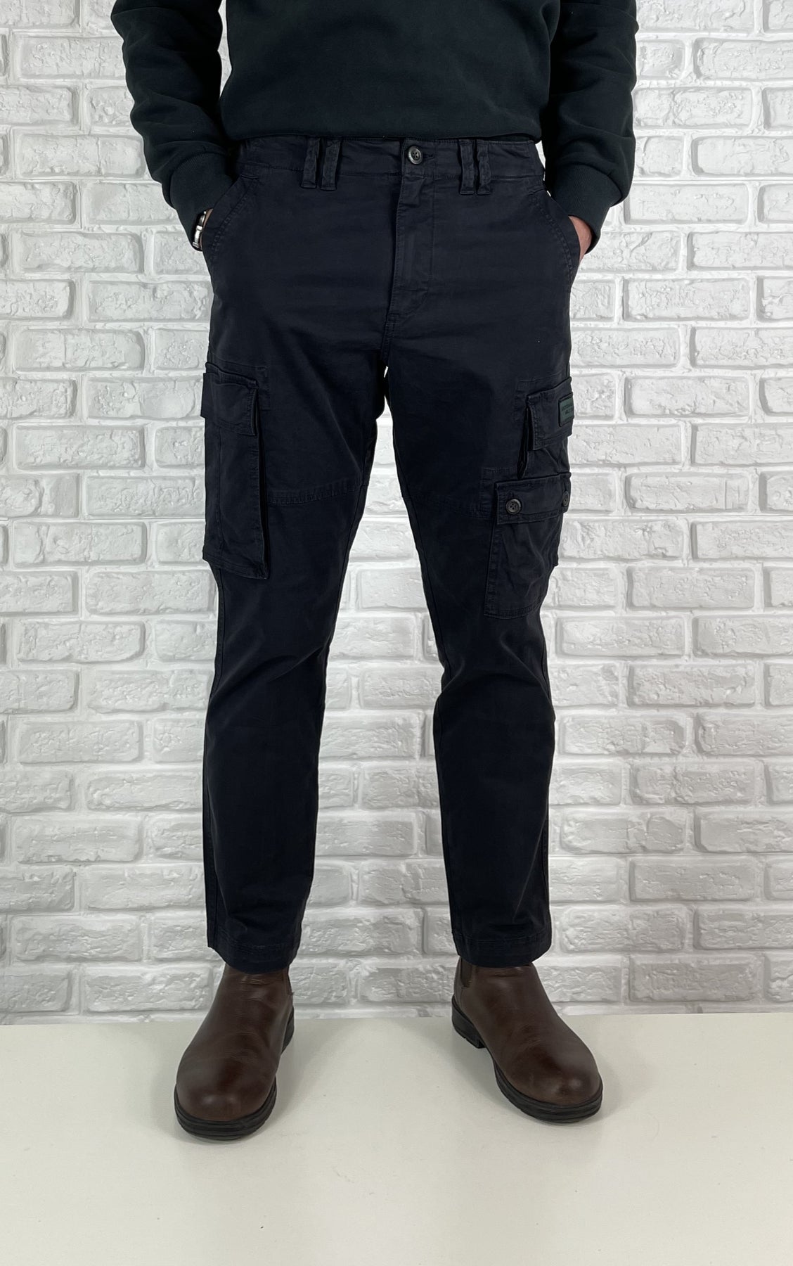 Pantaloni cargo in cotone stretch blu, con tasche laterali chino aperte per comodità e grandi tasconi sulle gambe con pattina e bottoni a pressione. Sulla gamba sinistra spicca una seconda tasca sovrapposta con bottoni a vista e il logo Aeronautica Militare, per un dettaglio unico. Le tasche posteriori chiudono con pattina e bottone, mentre il fondo dritto e la chiusura con zip e bottone completano il design. Il tutto in una vestibilità slim fit, perfetta per un look stiloso e pratico!