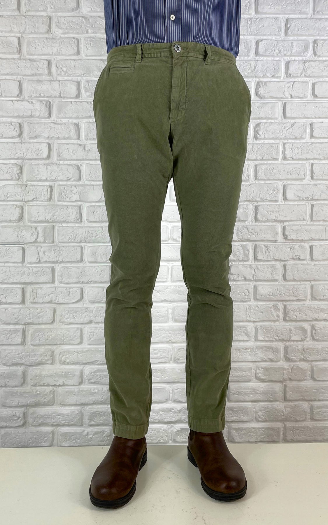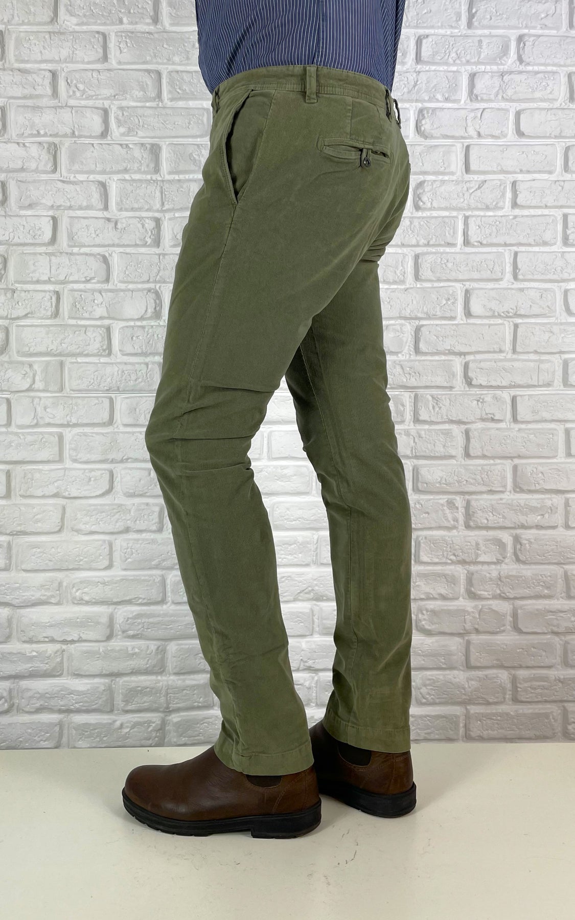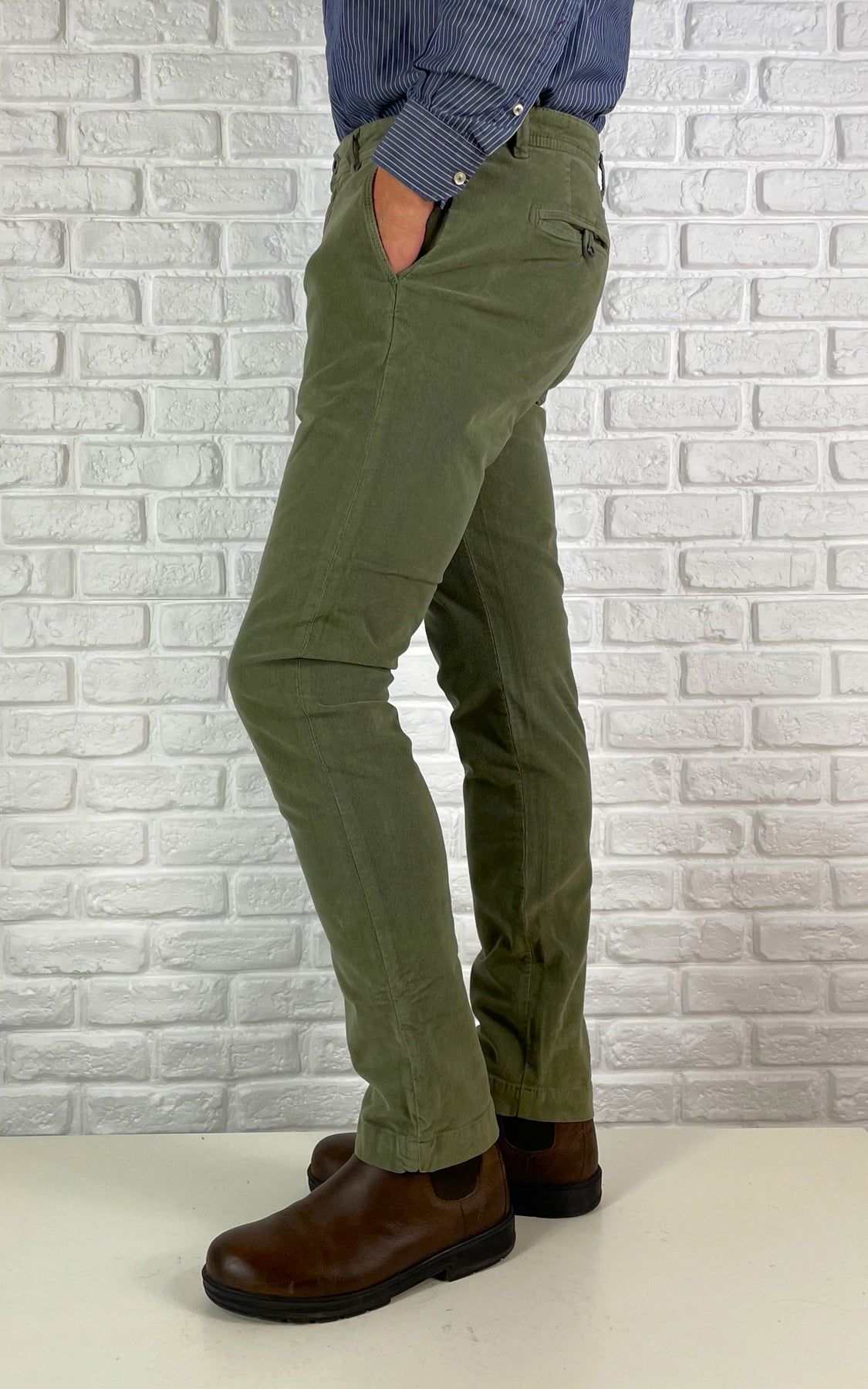 Prezzo Standard €99,00PANTALONE IN VELLUTO MILLERIGHE STRETCH COLORE VERDE SALVIA, TASCHE LATERALI CHINO, TASCHE POSTERIORI A FILETTO CON BOTTONE, CHIUSURA ZIP E BOTTONE, VESTIBILITA' SLIM FIT.