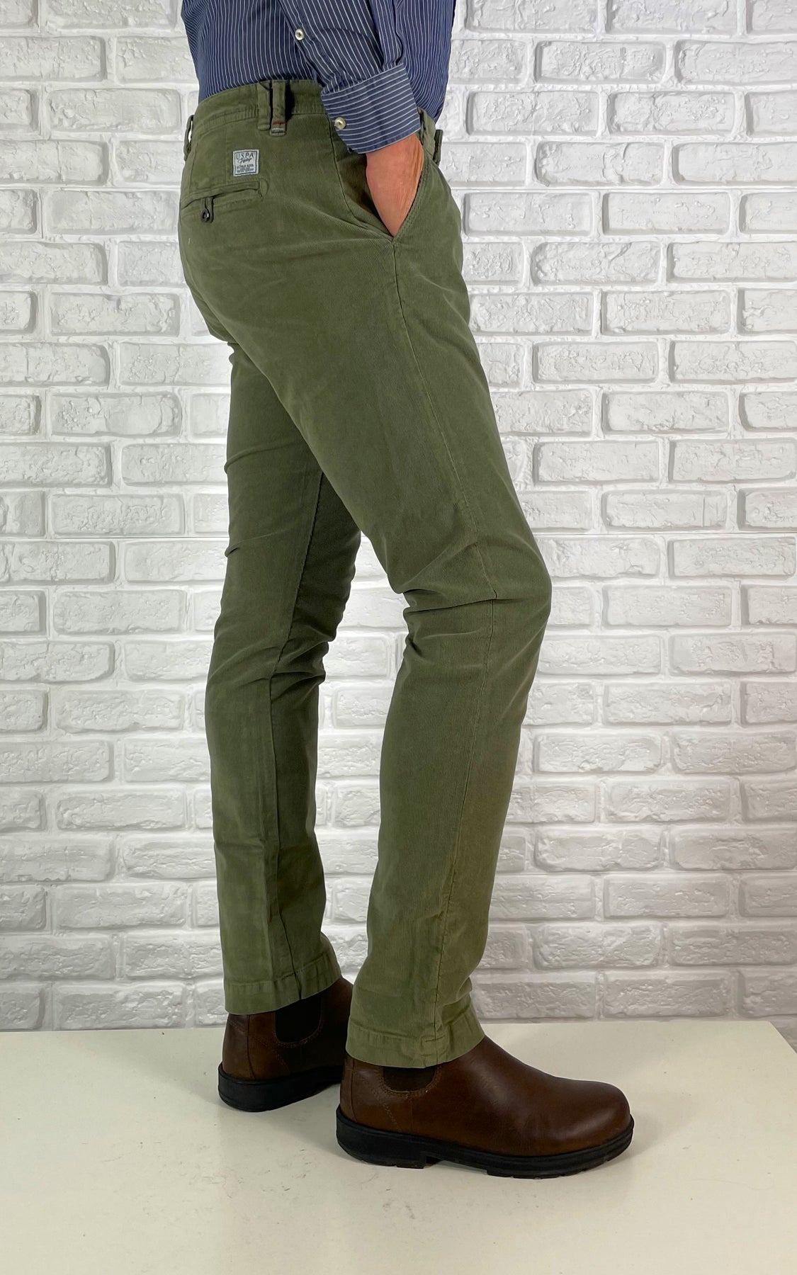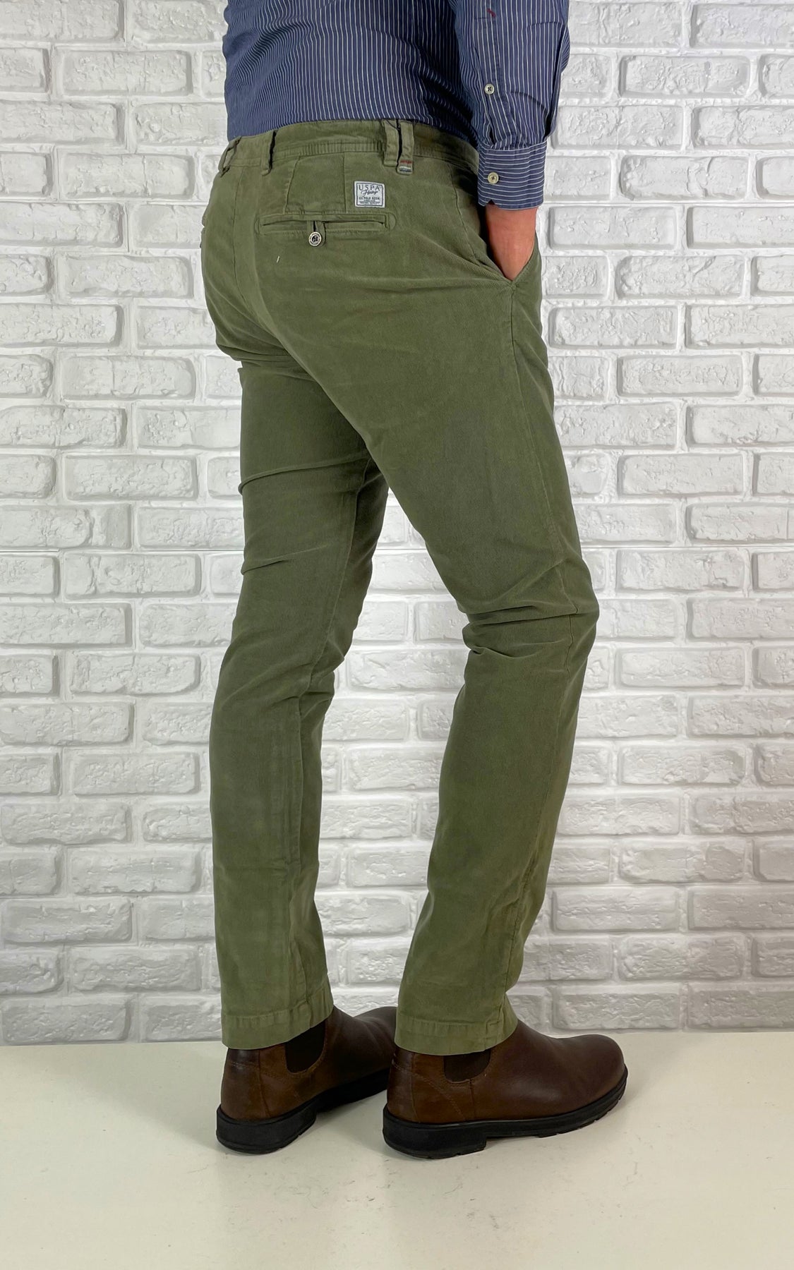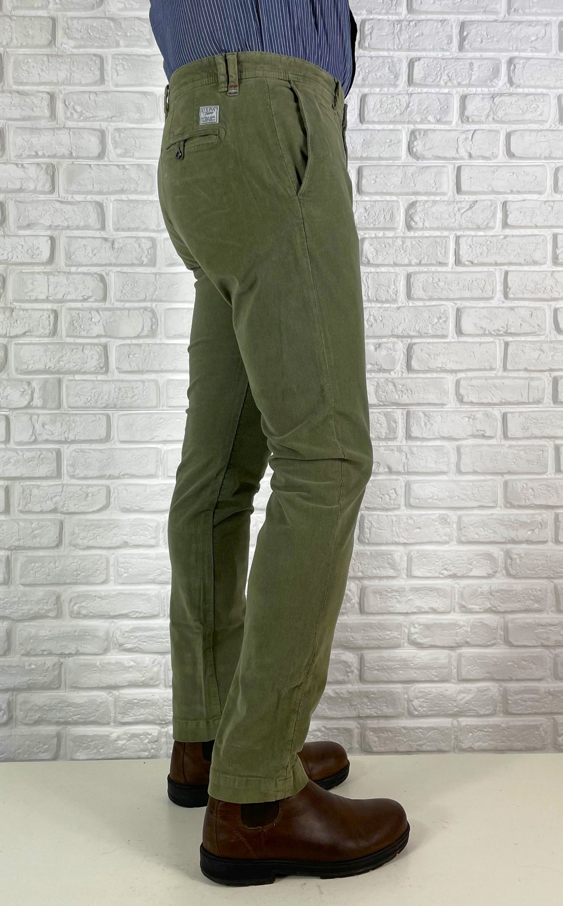 Prezzo Standard €99,00PANTALONE IN VELLUTO MILLERIGHE STRETCH COLORE VERDE SALVIA, TASCHE LATERALI CHINO, TASCHE POSTERIORI A FILETTO CON BOTTONE, CHIUSURA ZIP E BOTTONE, VESTIBILITA' SLIM FIT.
